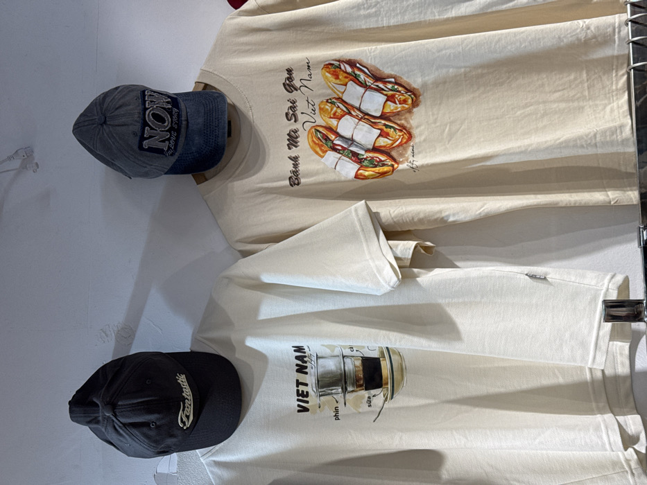 Two cream-colored t-shirts and two baseball caps are displayed against a white wall in a retail establishment in Thủ Đức, Vietnam
