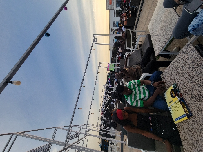 An outdoor venue is filled with seated people at tables. A woman with a red headband sits at a table with a man wearing a green and white striped shirt. Another man sits at a table behind them. Numerous people occupy seating in the background. The sky is visible above the venue. String lights hang from a metal structure.