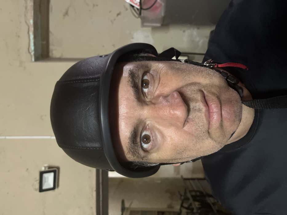 A male subject, appearing middle-aged, is depicted in a close-up, chest-up portrait. He is wearing a black, open-face style helmet with a black rim and a black chin strap featuring a red fabric accent on the right side. The subject's face exhibits a wide-eyed, direct stare at the camera, accompanied by a slight grimace or puckered expression around the mouth. His complexion is light to medium, with visible stubble on the lower face. He wears a dark-colored shirt. The background consists of an interior space with light-colored, textured walls. To the subject's upper left, a white, rectangular wall-mounted light fixture is present. To the subject's upper right, an open doorway or archway reveals a deeper, dimly lit interior, within which indistinct shapes, possibly bicycles, are discernible to the left. The wall near the doorway exhibits signs of wear, including chipped plaster revealing an underlying green layer. This scene takes place in San Fernando del Valle de Catamarca, Argentina.