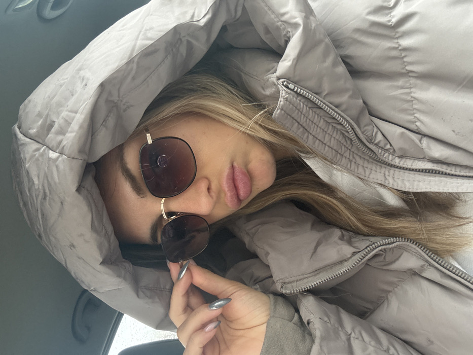 A light-skinned female individual is depicted from the chest up, positioned within a vehicle interior. She wears a light grey or beige padded winter jacket with the hood pulled over her head, partially covering her blonde hair. Her face is directed towards the viewer, making a pouting expression with her lips. She wears square-framed sunglasses with dark lenses and thin gold-colored frames; a distinct crack or scratch is visible on the right lens. Her right hand, displaying metallic silver/grey manicured fingernails, is raised, appearing to adjust or hold the right temple of the sunglasses. The background in the upper left shows a blurred window with visible raindrops, indicating precipitation. The specific location within Plovdiv, Bulgaria, cannot be determined from the visual information provided.