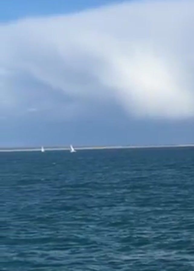 The camera films a seascape on a partially cloudy day. The sea is moderately choppy, with a dark blue color. Several sailboats with white sails are seen in the distance, scattered across the water. A long, thin stretch of land is visible on the horizon, appearing as a faint line between the sea and the sky. The sky is a mix of blue and white clouds, with some darker patches suggesting potential rain. The overall impression is one of a calm but active day at sea.