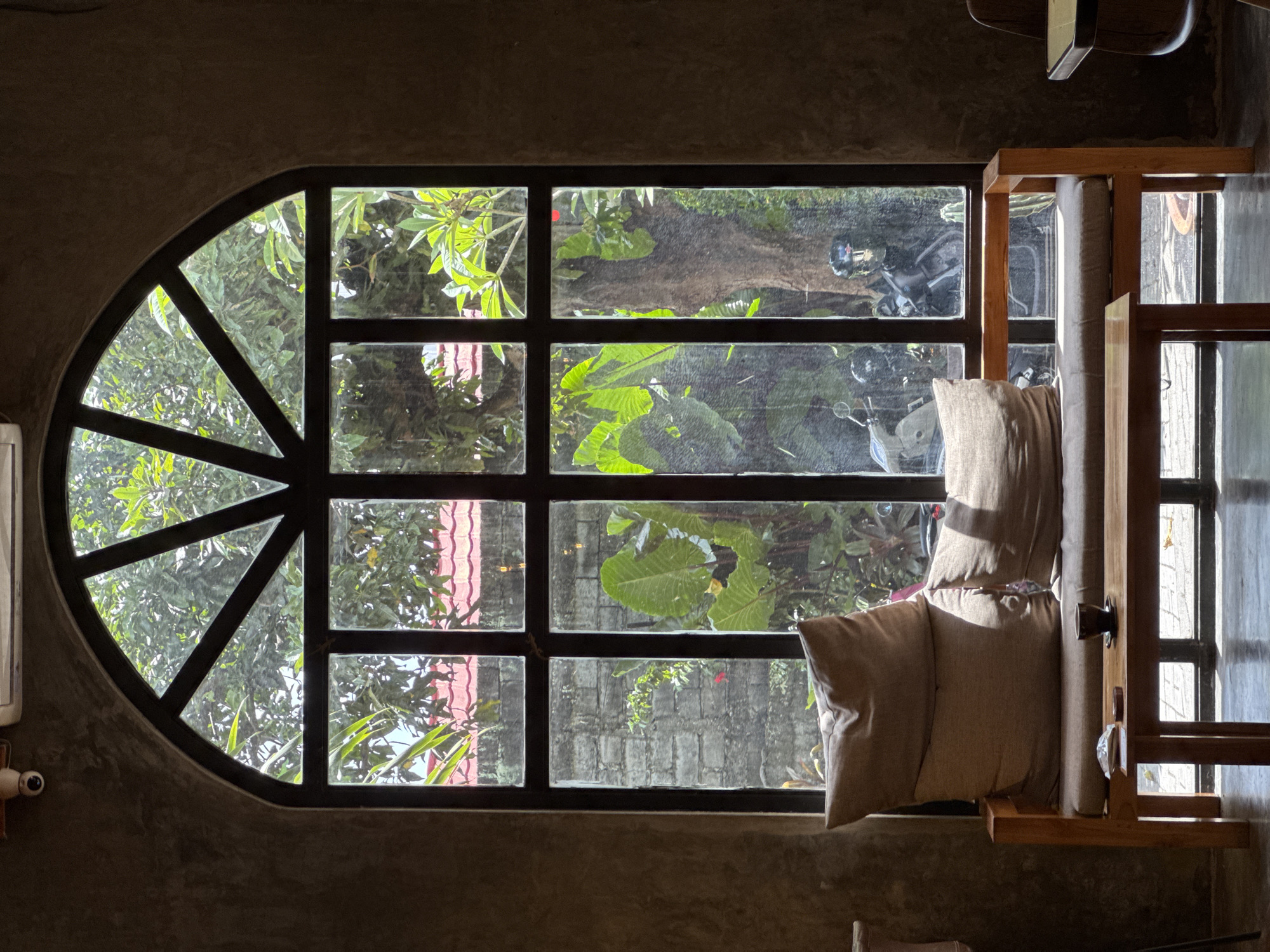 The photograph depicts an interior space in Denpasar, Indonesia, featuring a large window with a unique design. The window frame is dark, and it is divided into multiple panes. The left side of the window has a semicircular section with radiating spokes, while the right side is rectangular. Through the window, one can see lush greenery, including trees and plants, as well as a brick wall. In the middle panes of the window, a parked motorcycle or scooter is partly visible. Inside, adjacent to the window, a wooden chair or seating arrangement is visible, complete with cushions and pillows. The walls of the interior space are textured and appear to be made of concrete or a similar material. A portion of a ceiling and a bit of another chair is visible in the background. The light in the room appears dim, with some areas illuminated by sunlight streaming through the window.