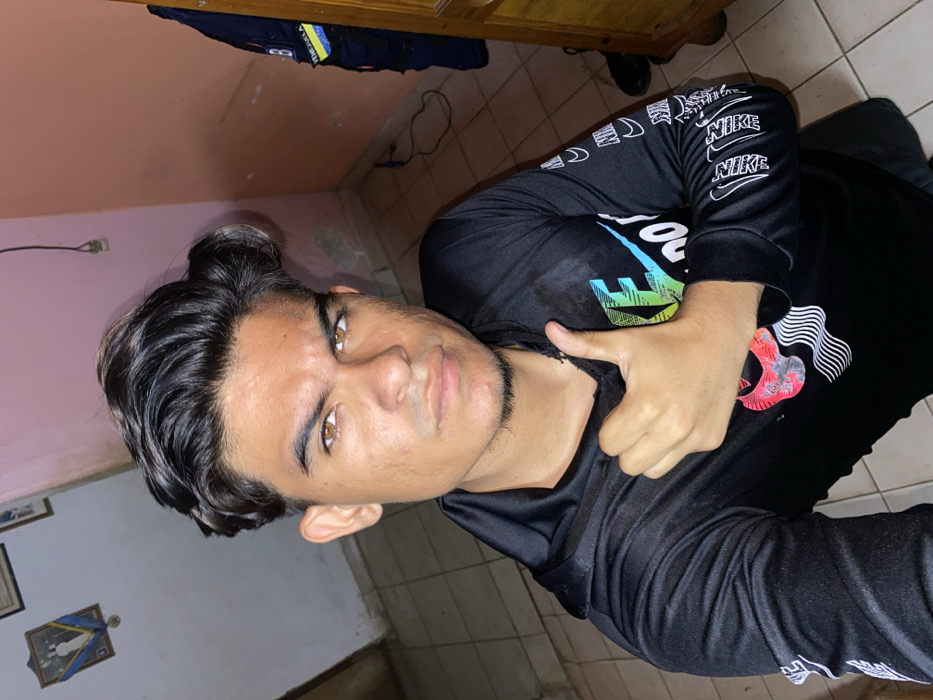 A male individual is positioned prominently in the foreground, facing the camera. He appears to be a young adult with dark hair, brown eyes, and light facial stubble. He wears a black long-sleeved hooded shirt featuring a multi-colored Nike graphic on the chest and repetitive white Nike branding on the left sleeve. His right hand is raised, forming a thumbs-up gesture. The indoor background shows a room with light-colored floor tiles. The wall to the left is light grey and holds a framed object, possibly an award. The wall to the right is a muted peach color, displaying minor wear, an electrical outlet, and a dark power cord hanging from it. A dark wooden door frame is visible to the far right, with a dark blue uniform jacket displaying a 'VENEZUELA' patch hanging nearby. Loose dark wiring is present on the floor against the right wall. While the uniform patch confirms the national context as Venezuela, specific identifying visual elements to pinpoint the exact location within Juan Griego are absent.