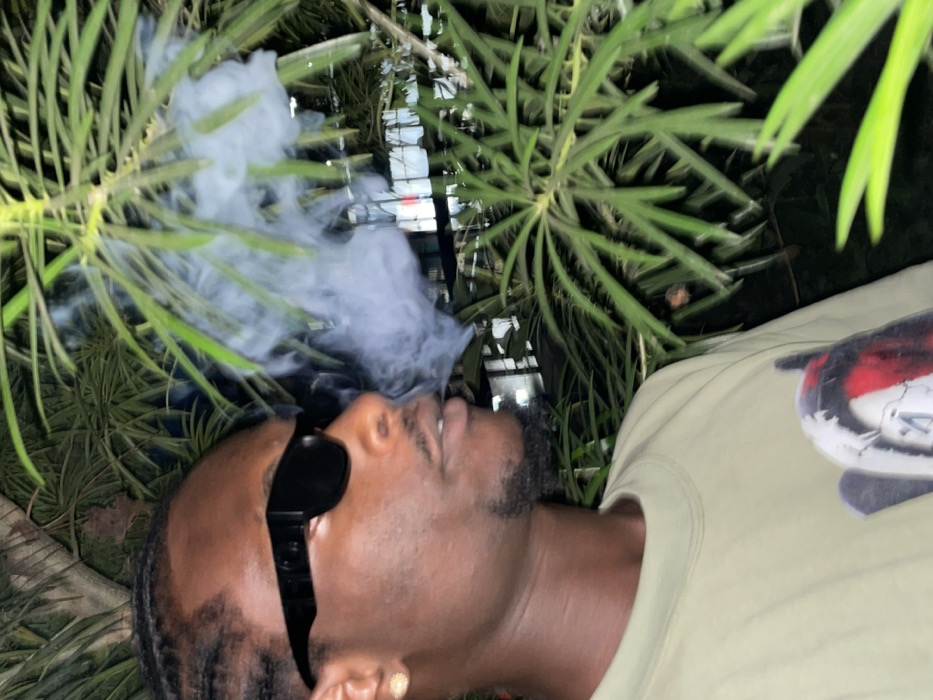 - "A man wearing sunglasses and a light green t-shirt exhales smoke near green plants" by FM-mc6eQ2, licensed under CC BY 4.0