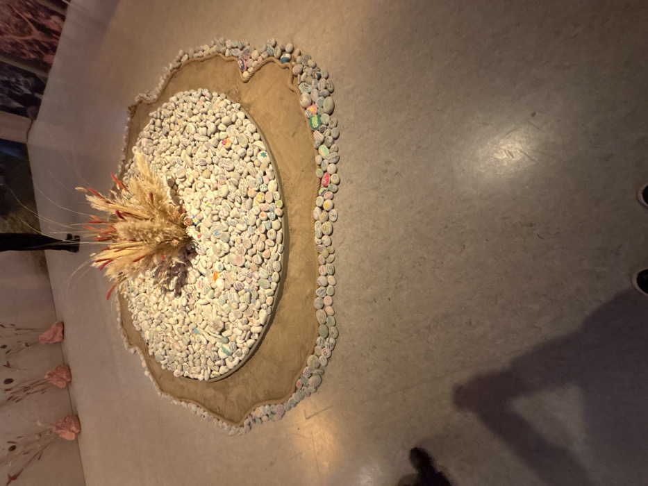 An interior scene in Berlin, Germany, displays a prominent circular art installation on a polished concrete floor. The central feature is a raised circular bed filled with numerous smooth, light-colored pebbles, many of which bear colorful painted marks, symbols, or text. From the center of this pebble bed emerges a dense cluster of dried pampas grass or similar feathery reeds, predominantly light brown with reddish tips. This inner pebble circle is bordered by a dark gray rim and surrounded by a slightly wider, lower ring of brown, possibly compacted earth or sand. An irregular, undulating border of similar light-colored, marked pebbles outlines the outer edge of the brown ring, defining the installation's perimeter on the concrete floor. This outer pebble border is also partially lined with a light-colored rope. In the background, against a pale wall, are several indistinct decorative elements appearing as dried plants or grasses arranged in pink, organically shaped bases. To the right of these elements, the lower legs and feet of a person are visible, wearing dark trousers and black shoes. In the immediate foreground, dark shadows of at least two individuals, including the photographer's feet in black shoes, are cast onto the concrete floor. The overall lighting is dim and artificial.