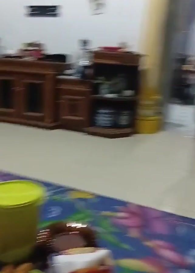 interior of a house with a meal laid out on a floral patterned mat on the floor