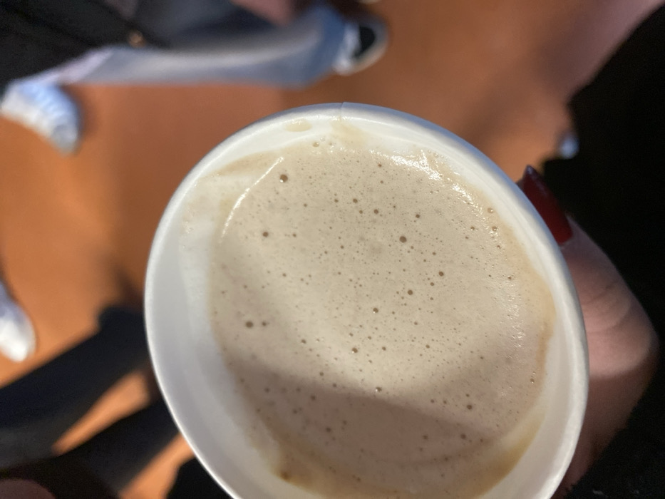 - "A white disposable cup, held by a hand with red-painted fingernails, contains a light brown, frothy beverage exhibiting numerous small bubbles on its surface" by FM-neMH23, licensed under CC BY 4.0