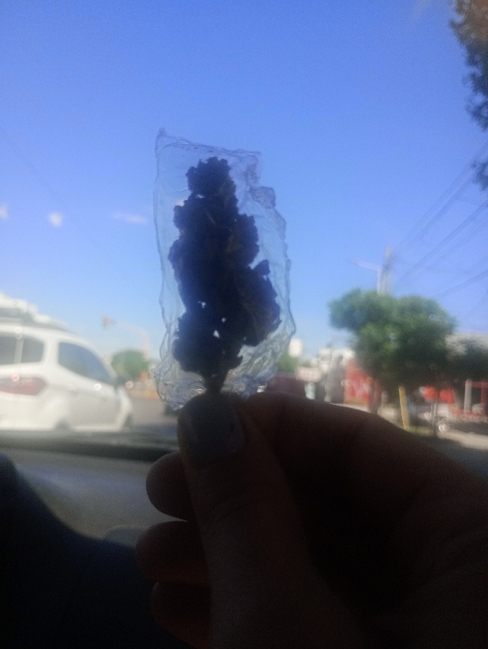 A hand holds a clear plastic bag containing what appears to be a dark, dried flower or plant. The background features a bright blue sky, trees, and a street scene with cars. The photo is taken from inside a vehicle, with the dashboard visible in the foreground. The hand and the bag's contents are mostly in shadow.