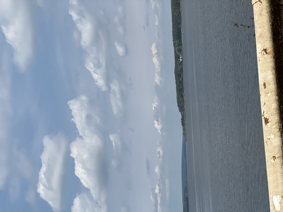 The image depicts a wide landscape view of the Pechinehi Reservoir, located near Staryi Saltiv, Ukraine. In the immediate foreground, a weathered, light-colored barrier, possibly concrete or metal, with significant rust and peeling paint, spans the lower portion of the frame. The midground is dominated by the expansive, grey-blue water of the reservoir, exhibiting subtle ripples across its surface. The distant right bank features a dense, dark green forest of coniferous trees. Within this treeline, a small, light-colored building with a dark, peaked roof is partially visible. The distant left bank appears as a low, indistinct landmass receding towards the horizon. The sky is light blue, occupied by numerous scattered white cumulus clouds. No people or active subjects are visible.