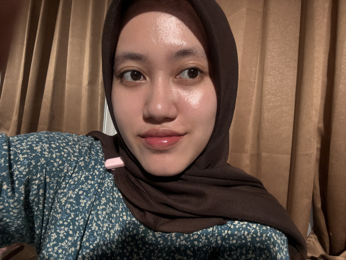 A close-up portrait depicts a young female individual in an indoor setting, identified as Gadingrejo, Indonesia. She is positioned facing forward, with her head slightly tilted and her gaze directed towards her right (viewer's left). The individual wears a dark brown hijab covering her head and neck, and a teal-colored garment featuring a white floral pattern. A light pink clip-like object is visible near her right shoulder. Her complexion is well-lit, with highlights prominent on her forehead and nose bridge, and her lips appear glossy. The background consists of vertically pleated, light brown curtains. The scene suggests a posed photograph.