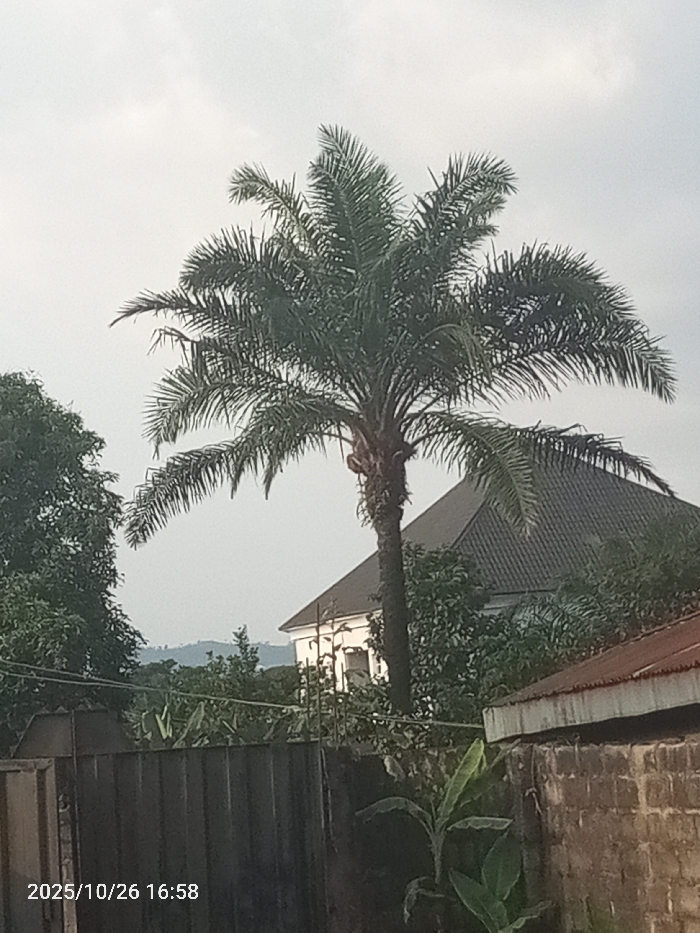The image displays an outdoor scene under an overcast sky, timestamped 2025/10/26 16:58, in the city of Unknown, Unknown. A large palm tree with dark green fronds and a textured trunk stands prominently in the center-right. To the immediate right of the palm tree, a multi-story white building with a dark, steeply pitched, tiled roof is partially visible, interspersed with green foliage. In the far background, hazy blue-green hills or mountains are discernible. The mid-left features a dense cluster of dark green trees. In the foreground, a dark corrugated metal fence or gate occupies the bottom-left, while a reddish-brown brick wall is visible on the bottom-right. Between these structures and extending towards the mid-ground, various green plants, including several large-leafed specimens resembling banana plants, are present. No individuals are depicted in the scene.