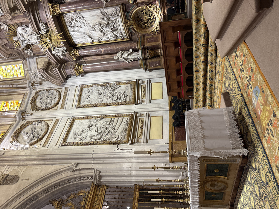 The image displays the interior of the Cuenca Cathedral, Cuenca, Spain, specifically a richly decorated chapel or transept. The scene is unoccupied. In the foreground, a rectangular altar, draped with a white tablecloth featuring a lace trim, is positioned slightly to the left. On the altar, six unlit white candles are arranged in ornate brass candlesticks of varying heights. The front of the altar is adorned with gilded decorative elements and a central oval medallion. The floor is covered by an ornate rug, patterned in gold, blue, and black, which extends towards the mid-ground and ascends via three carpeted steps to a raised platform. On this platform, a dark wooden choir stall with six red upholstered seats is centrally positioned. Behind the stalls, several black stackable chairs are visible against a lighter, unadorned wall section. The walls are elaborately decorated. The left wall features a light-colored surface adorned with four framed white relief sculptures: two large rectangular panels depicting multiple figures in various poses, and two smaller oval panels positioned above them. All reliefs are framed with gilded, ornate borders. The right wall is characterized by tall, polished reddish-brown marble columns with gilded Corinthian capitals. Integrated into this wall are further relief sculptures, including a large rectangular panel depicting multiple figures, and a white marble statue of a standing robed figure on a pedestal located between two columns. Above, an elaborate sculptural group with radiating golden elements is present. High on the right, portions of stained-glass windows with yellow and orange geometric patterns are visible, along with arched structural elements.