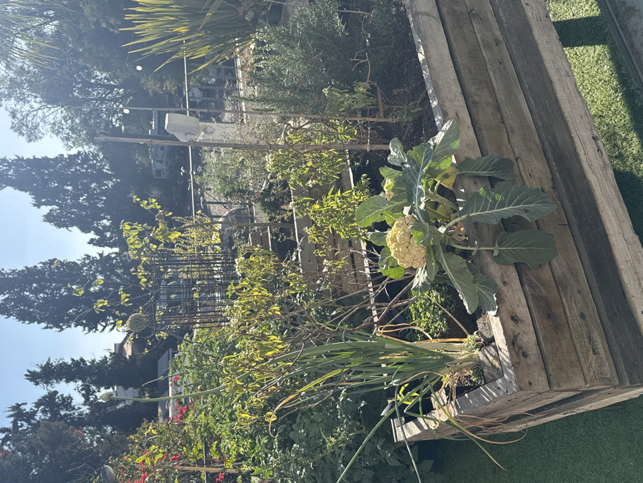 A wooden raised garden bed is filled with various plants. Mature cauliflower with large leaves is prominently displayed. Long, green scallions are visible near the bed's edge, some with flowering heads. A wire trellis supports climbing vegetation. Other herbs or vegetables fill the space, including rosemary. Trees and buildings are in the background under a clear sky. The bed is situated outdoors on what appears to be synthetic grass.