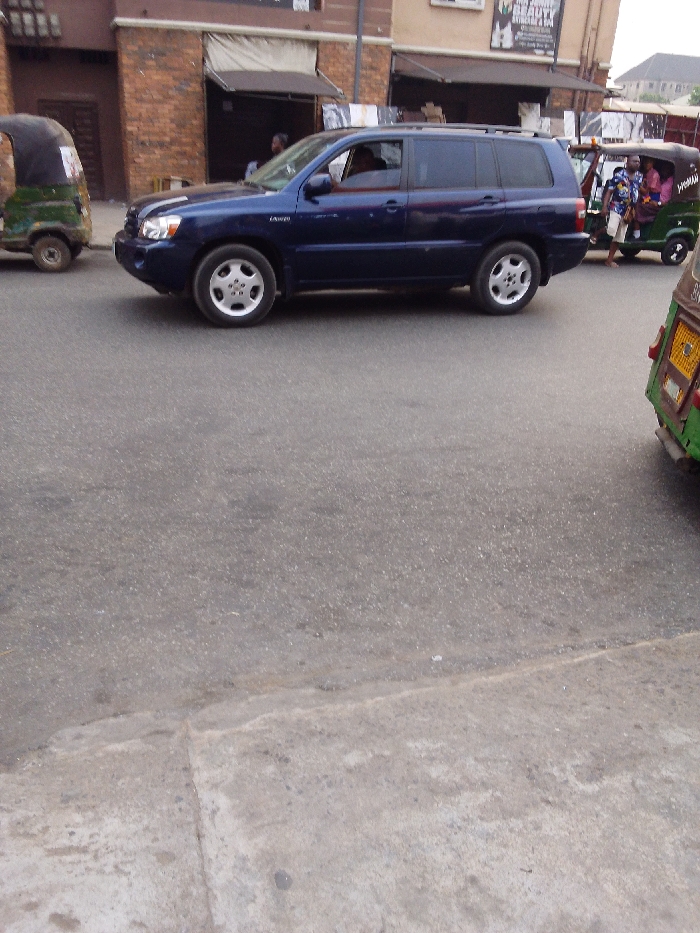 The image depicts a daylight street scene in Aba, Nigeria. A dark blue Toyota Highlander SUV is positioned centrally on an asphalt road, viewed from its left profile, with a driver visible inside. To the left of the SUV, a green and black motorized tricycle is partially visible, facing away from the camera. To the right, another green and black motorized tricycle, also partially obscured and facing away, transports multiple passengers including adults and children. The foreground consists of asphalt road transitioning to a concrete curb and sidewalk. In the background, multi-story commercial buildings with brick and painted facades line the street, featuring storefronts and visible signage, including one advertising a "BEAUTY SALON & SPA."