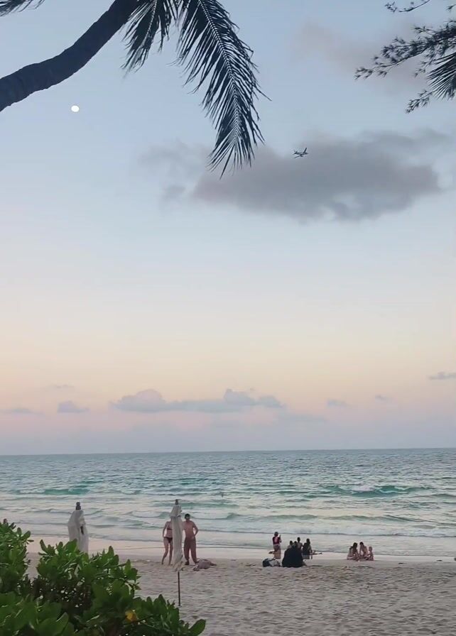 beach scene with a palm tree in the foreground, partially obscuring the view of the ocean. The sky is a mix of pale blue, white, and pinkish hues, suggesting either dawn or dusk. A small airplane is visible in the sky, flying towards the horizon. On the sandy beach, several people are scattered around: some are standing near the water, others are sitting or lounging on the sand. The water has gentle waves. There are some green plants near the edge of the beach in the foreground.