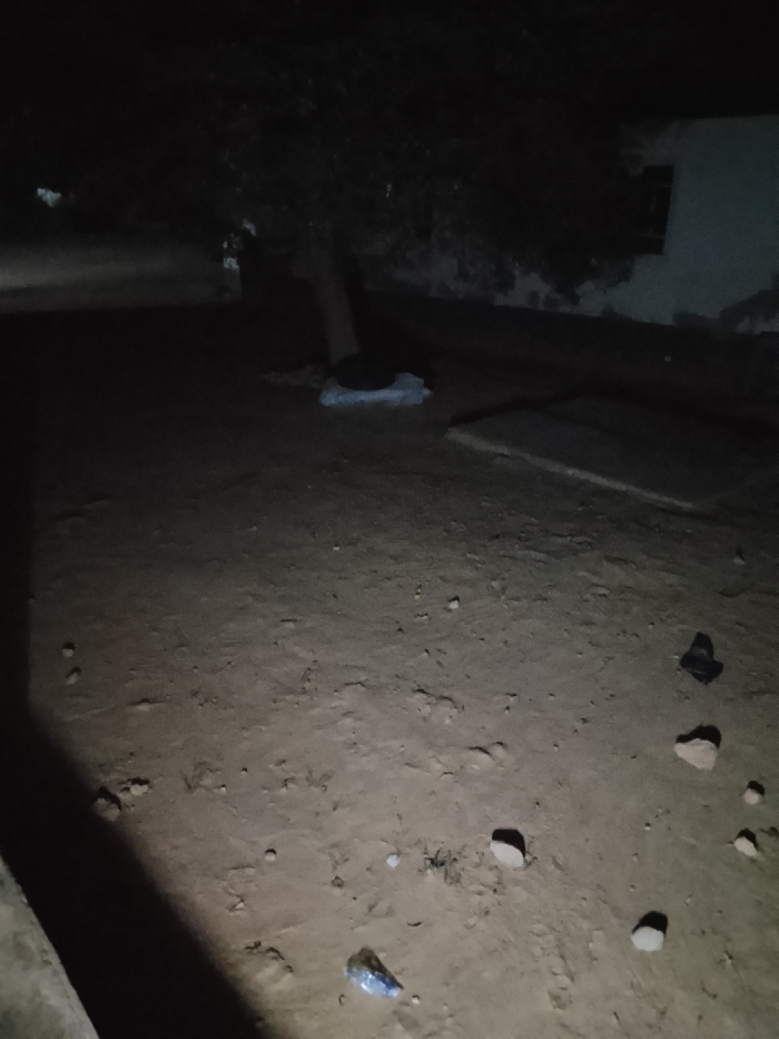 A dark, outdoor scene shows a dirt ground with scattered rocks and debris. A tree stands in the middle ground, partially obscuring a building behind it. Light reflects faintly off objects near the tree's base. Visibility is severely limited due to the darkness.