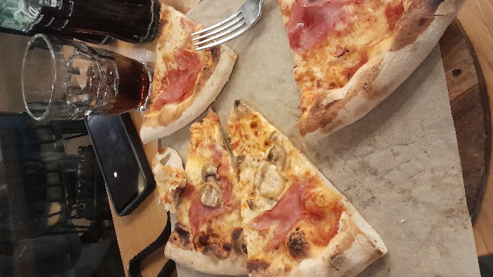 - "A high-angle shot captures a culinary scene featuring slices of pizza, a glass of dark liquid, and a fork on a parchment-lined wooden tray" by FM-gI3X12, licensed under CC BY 4.0