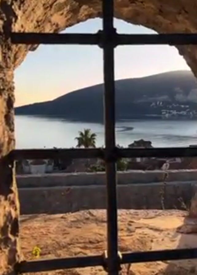 A fixed shot through a barred window shows a calm bay with mountains in the background. The window is set in a stone wall, and the bars are dark and metallic. Outside the window, a few palm trees and rooftops are visible along the shore. The sky is a light blue, and the sun is shining, giving the scene a warm glow. The water is reflecting the sunlight. The scene appears peaceful and serene.
