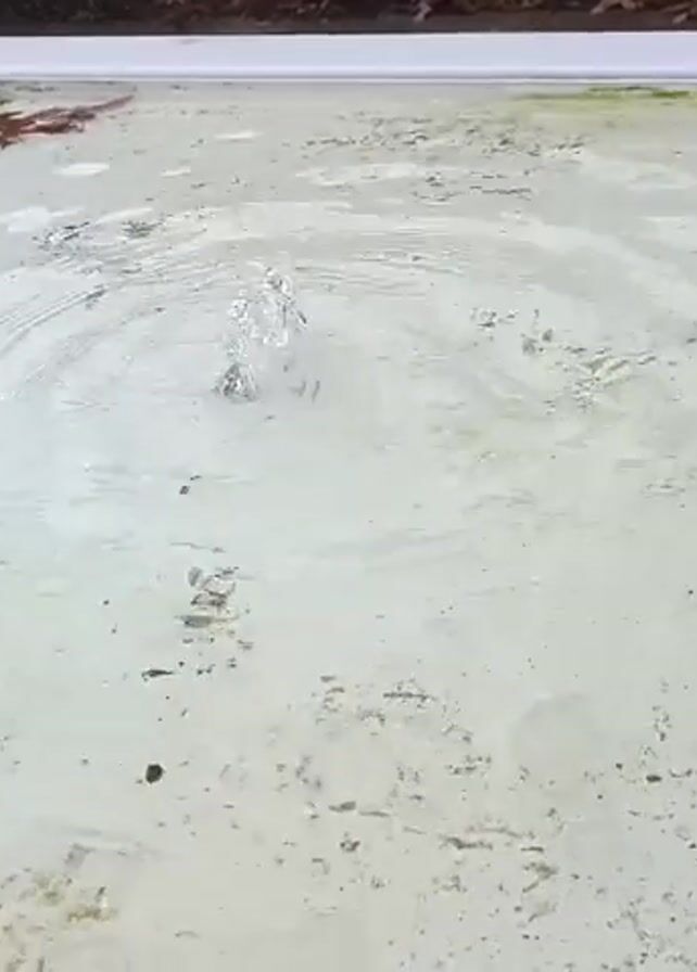 rectangular outdoor fountain with a white frame filled with water. A stream of water shoots up from the center of the fountain, creating ripples. There are some brown leaves floating in the water and around the edges of the fountain. The fountain sits on gray pavement. Next to the pavement is a gravel area with a rusty-colored bowl-shaped object. A gray brick wall is partially visible in the background.