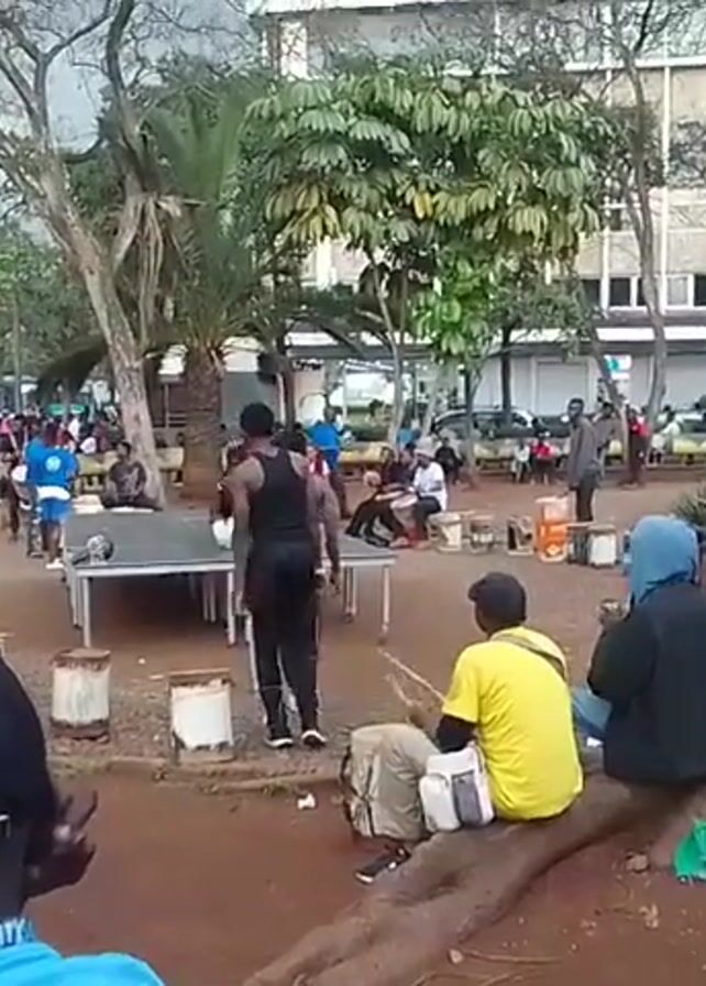 The scene captures a bustling urban park with a group of musicians performing in the center. They are playing drums, some standing and drumming around the perimeter, while others are seated. A man on a raised platform seems to be leading the performance. A crowd has gathered around, some sitting at the base of a large tree, watching and filming the musicians. The park is situated in a city, evidenced by the surrounding buildings and buses. The atmosphere appears lively and communal, with people enjoying the music in the public space.
