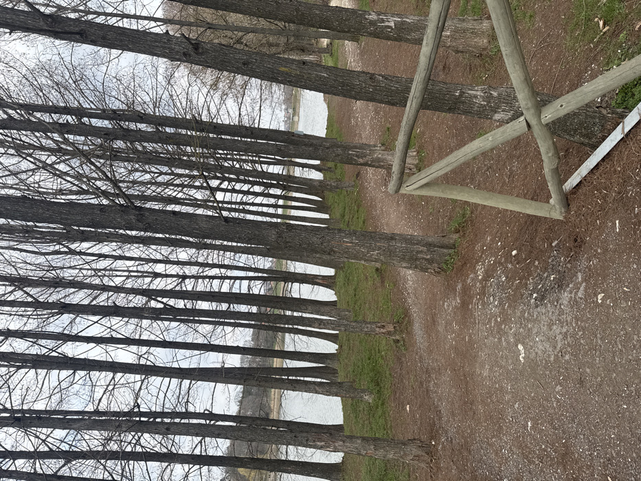 The scene depicts a lakeside pathway in Nikolovo, Bulgaria. The foreground features a dirt path, reddish-brown with scattered pebbles and dry organic debris, curving slightly towards the center-left. On the immediate right, a section of a light-colored wooden railing or fence is visible, constructed from posts and crossbeams, including a triangular support structure. A metallic strip lies on the ground beneath this railing. Along the left and middle portions of the frame, a dense line of numerous tall, slender deciduous trees stands, largely bare of foliage, suggesting a late winter or early spring season. These trees have dark bark and are closely spaced, forming a visual barrier. Green grass is present between sections of the path and the trees, extending towards the water's edge. Behind the line of trees, a large body of calm, light-colored water, consistent with a lake or reservoir, occupies the midground. The far side of the water reveals a distant, indistinct landmass or shoreline with minimal vegetation and what appears to be a bridge structure on the right horizon. The sky is uniformly overcast and light gray. No human figures, animals, or active subjects are present in the image.
