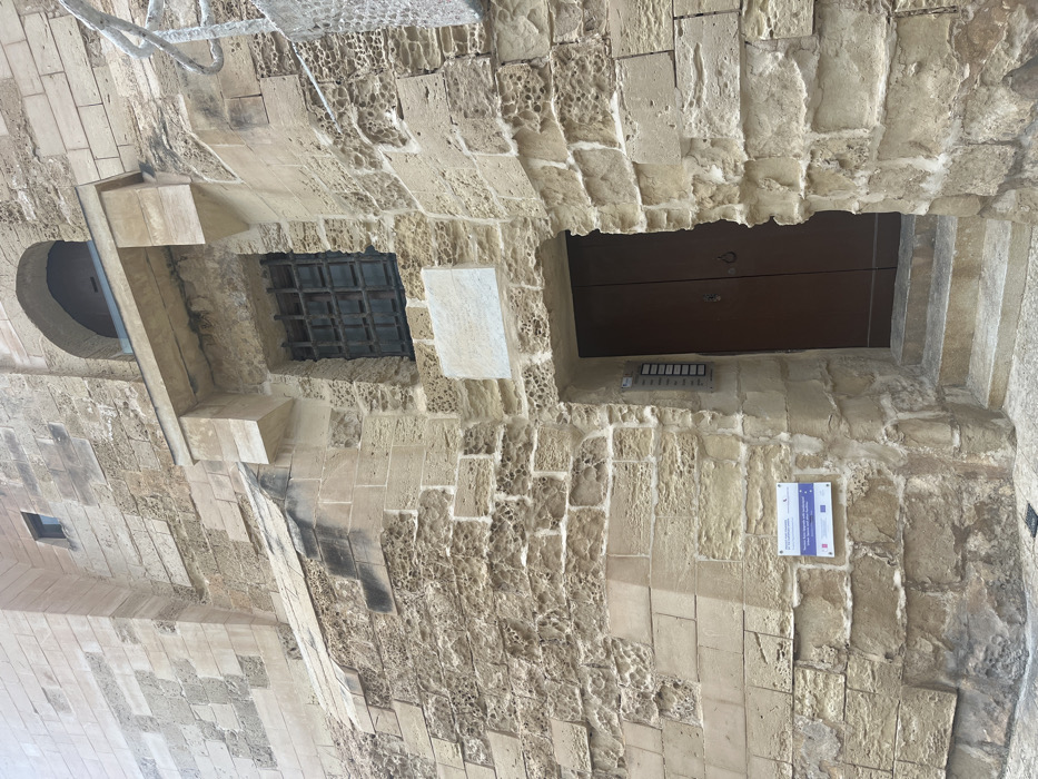 This image displays the weathered limestone facade of a building located in Saint Paul's Bay, Malta. The structure is characterized by multi-sized, light-colored stone blocks, many exhibiting pitting and dark staining, particularly on the upper left side beneath a sloping architectural element. A recessed, dark brown double door, fitted with two dark, round door pull-rings, serves as the main entrance. Two stone steps lead up to this door from the paved ground level. To the immediate left of the door, a vertical, multi-button grey intercom panel is mounted. Above the entrance, a rectangular, light-colored stone plaque with faint, unreadable inscriptions is affixed to the wall. Directly above this plaque, a square window secured by a dark, grid-patterned metal security grille is set into a deep recess. This window is surmounted by a projecting, multi-layered stone lintel/canopy. Higher on the facade, an arched opening is visible above the canopy, and a smaller, rectangular window is positioned further up and to the left. On the lower left section of the wall, a rectangular information plaque, featuring text and logos including what appears to be an EU flag, is mounted. A partial view of a light-colored, textured external railing or similar structure is visible on the far right edge of the frame. No individuals are present in the scene.