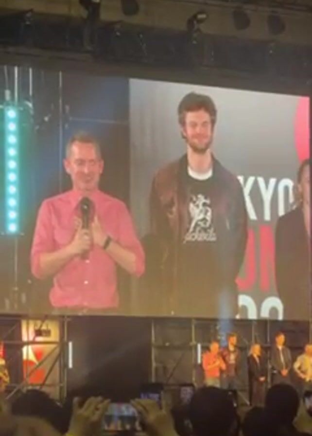 crowd of people watching a large screen at what appears to be a convention or similar event. On the screen, five people are standing on a raised platform, likely actors or celebrities. The person on the left is speaking into a microphone and the others are standing next to him. The backdrop behind them features the words "TOKYO COMIC CON 2023". People in the crowd are holding up their phones to record the event. The venue is large with visible metal scaffolding and stage lighting.