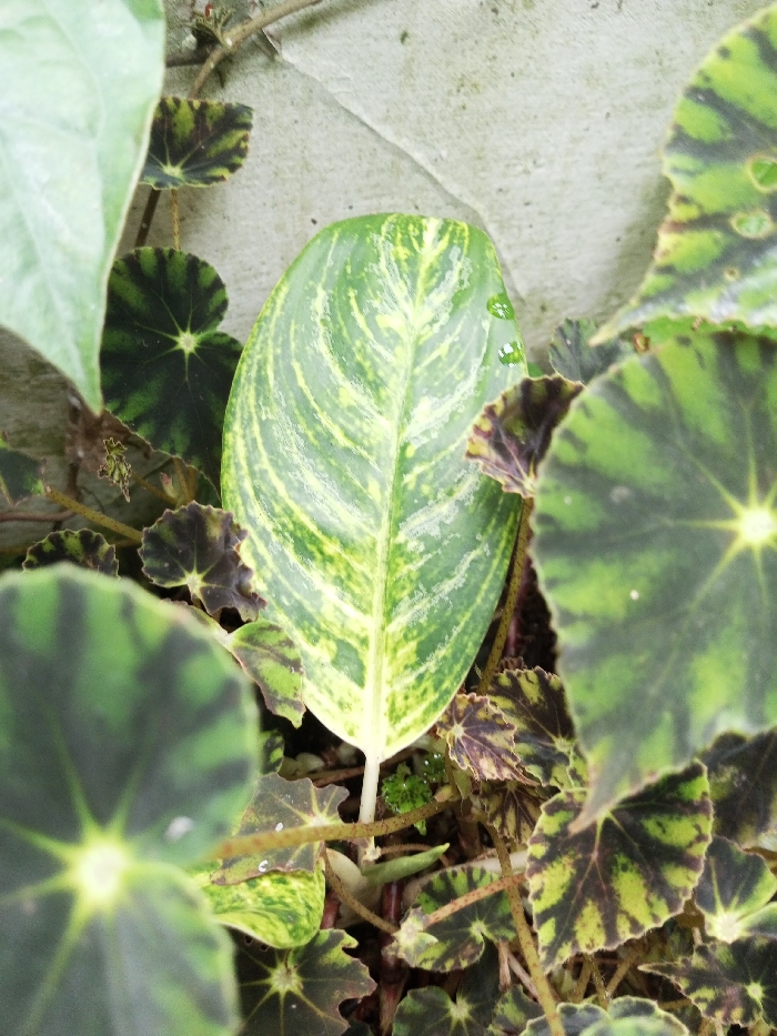 A close-up captures a lush botanical scene. A striking, elongated leaf with green and yellow variegation dominates the center. Smaller, round leaves with distinctive dark and light green radial patterns surround it. Some leaves have scalloped edges with a dark brown hue. The foliage emerges from a tangle of thin, brown stems. A neutral-colored wall provides a backdrop. The image focuses on the diverse textures and patterns of the plant life.