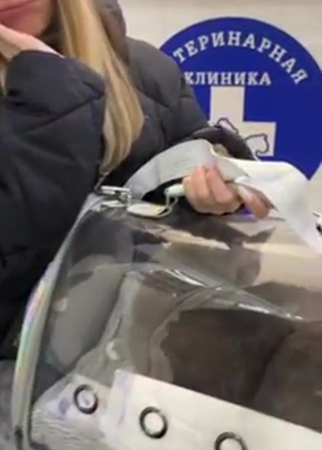 A young woman sits in a veterinary clinic waiting room. She wears a black puffer jacket, a grey beanie, and has blonde hair. She holds a clear pet carrier on her lap. Inside the carrier, a dark-colored animal, possibly a cat or small dog, is visible. In the background, a reception desk with a sign reading "ВЕТЕРИНАРНАЯ КЛИНИКА" (Veterinary Clinic in Russian) and a blue cross logo can be seen. A person sits behind the desk, but they are mostly out of focus. The woman looks slightly impatient or bored as she waits. The camera angle is close-up, focusing on the woman and the pet carrier.
