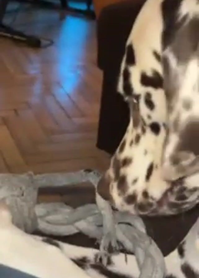 A spotted dog is lying on the lap of a person. The dog is white with brown spots. The person appears to be wearing denim. The dog is chewing on a gray rope toy. The camera zooms in and out slightly on the dog's head and the toy. The floor is made of wood. There is a brown couch in the background. There is a light that shines blue in the background.