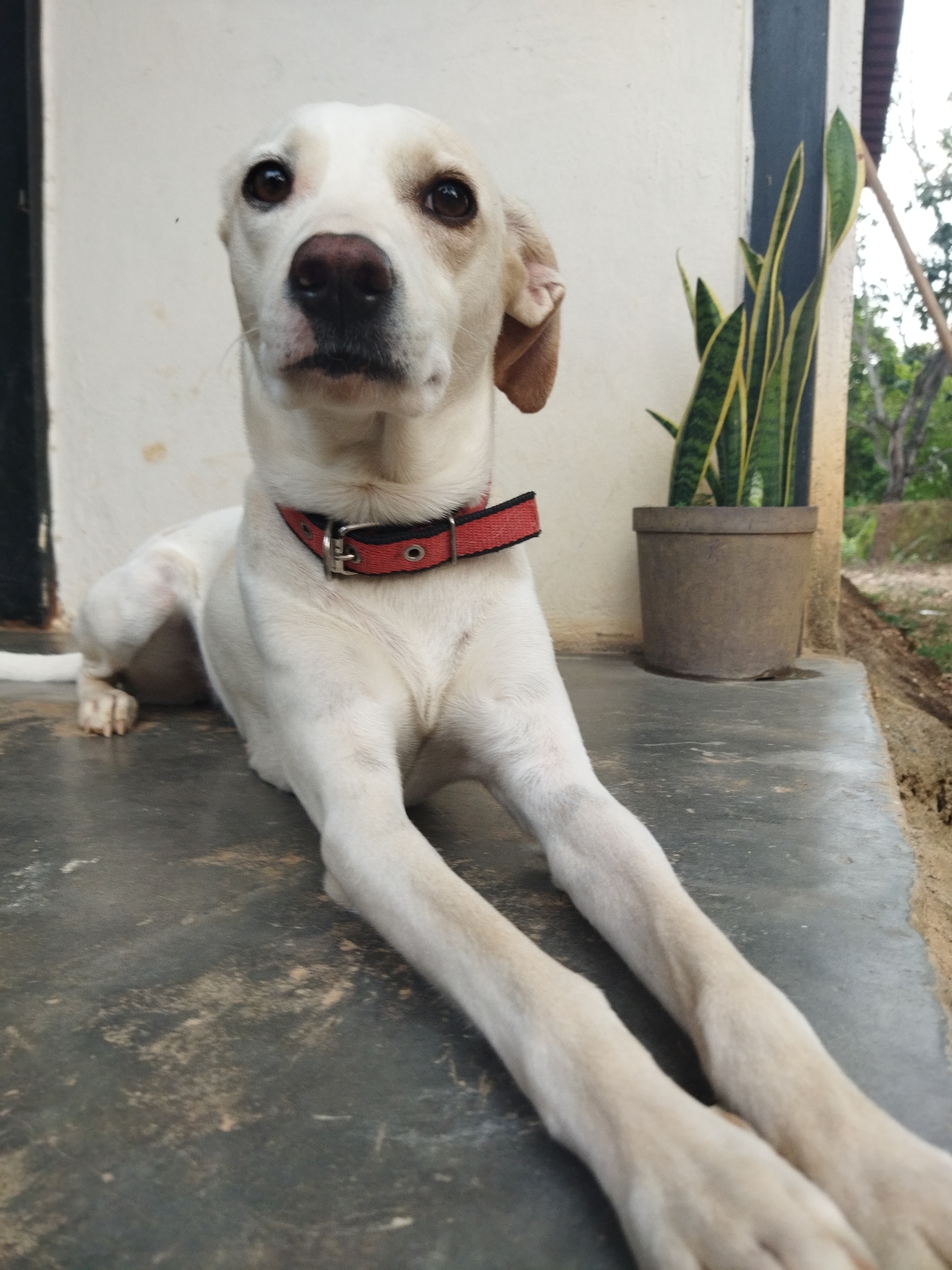 A white dog with a red collar is lying down on a concrete porch. Behind the dog is a white wall with a dark doorway and a potted snake plant. Beyond the porch and plant, vegetation is visible. The photograph was taken in Tinaquillo, Venezuela.