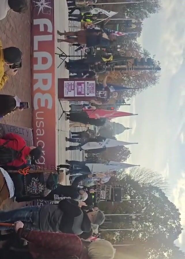 A crowd of people stand in front of a stage. A person stands at a podium on the stage and is speaking. The words “Remove and Impeach” are written on the podium. The stage has a banner that reads “FLARE”. Several people are holding signs. The U.S. Capitol Building is visible in the background. Trees are around the perimeter of the crowd. The sky is cloudy.