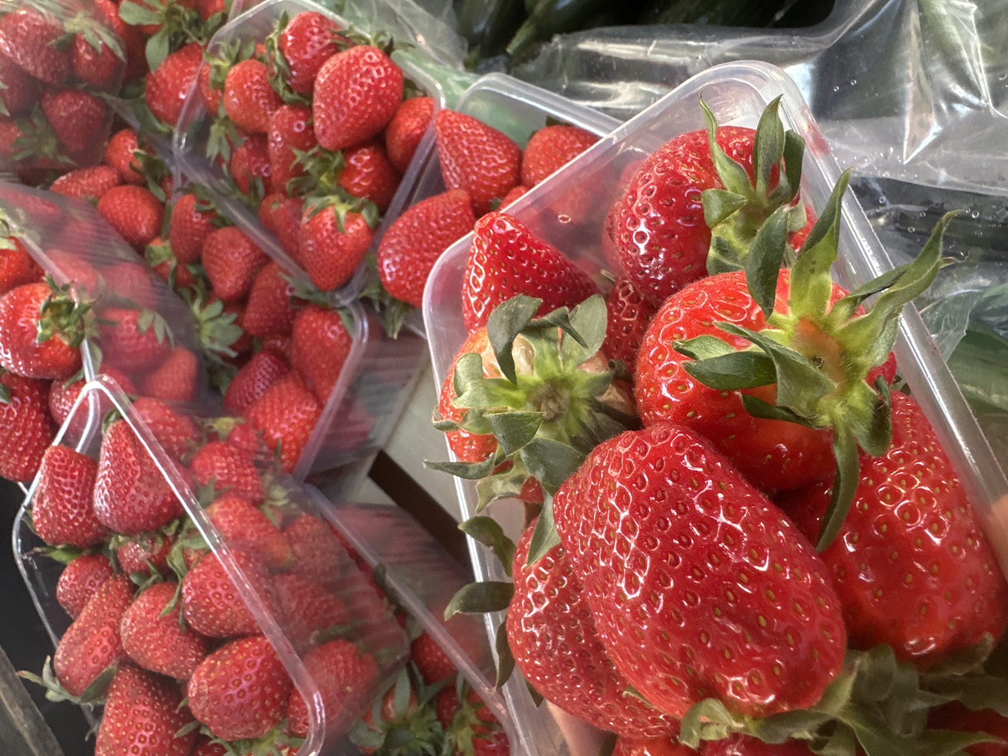 - "The image displays an overhead view of numerous clear plastic punnets filled with fresh, ripe red strawberries, arranged in what appears to be a retail or market setting in Lukovit, Bulgaria" by FM-PF0WK2, licensed under CC BY 4.0