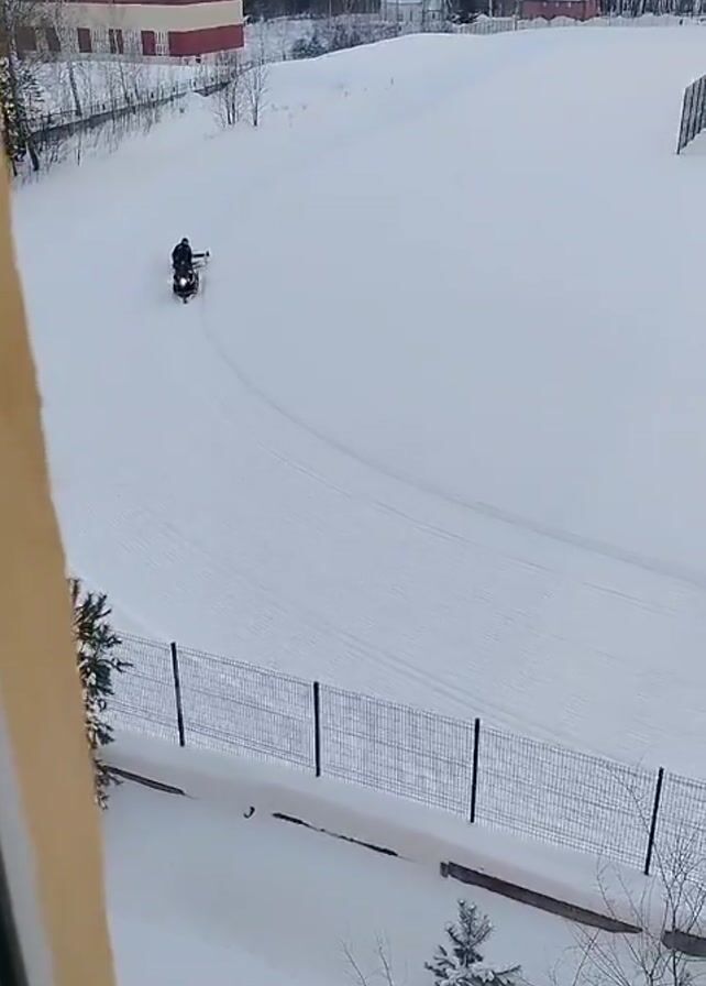From an elevated position, likely a window, the scene unfolds on a snow-covered field, with a person riding a snowmobile pulling some sort of sled behind it