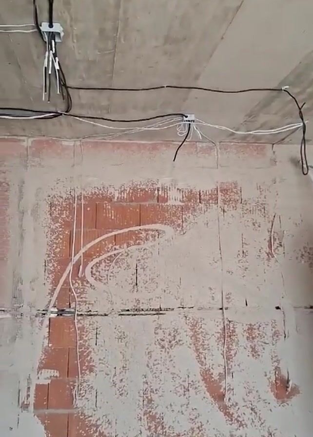 man applying plaster to an interior wall. The room is in the process of being renovated, with exposed brick and electrical wiring visible. The man is wearing a grey sweatshirt and dark pants. He is using a spray gun connected to a hose to apply the plaster evenly to the wall. The ceiling is bare concrete. The wall has visible remnants of previous layers of plaster and some embedded wires. The man is working on the corner of the wall.