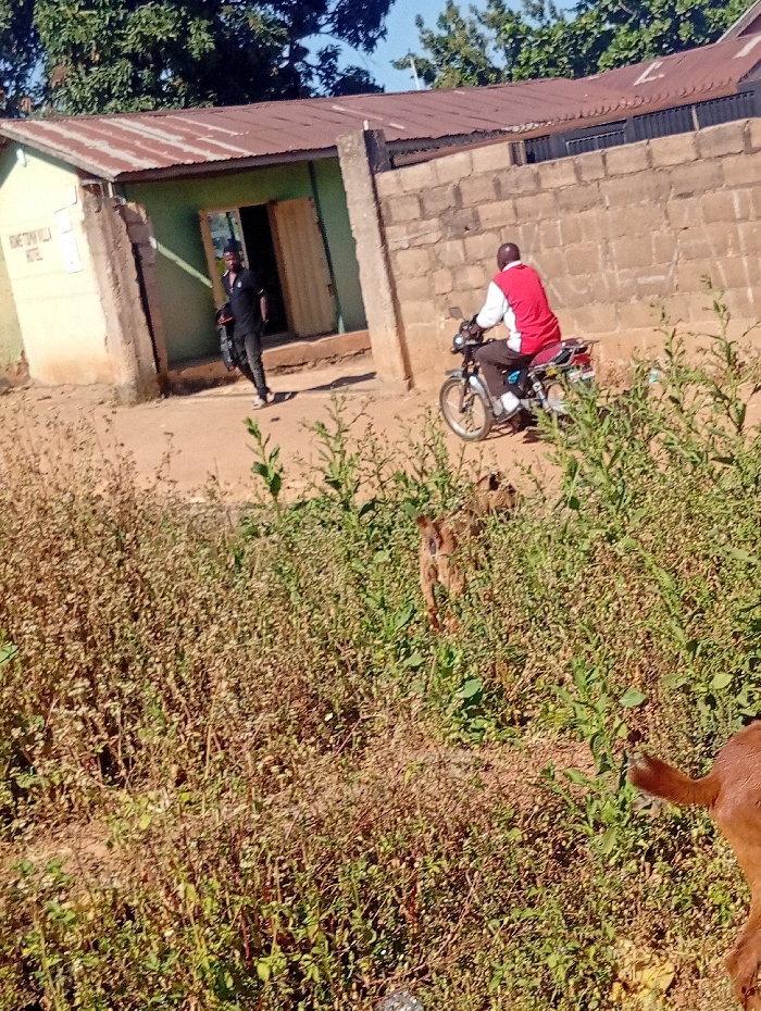 This image depicts an outdoor scene in Zawan, Nigeria. In the foreground, a field of dry, mixed vegetation and sparse green weeds covers the lower half of the frame. The rear portion of a light brown goat is visible in the bottom right corner, while a smaller, similarly colored goat is partially obscured by vegetation further back in the field. In the midground, a light green, single-story building with a rusted corrugated metal roof is visible on the left. A white sign, partially legible as "HOMETOWN VILLA HOTEL," is affixed to its left exterior wall. An individual wearing a black short-sleeved shirt and black trousers is stepping out of the building's open doorway, looking towards the right side of the frame and carrying a dark object in their left hand. To the right of this building, a grey concrete block wall extends horizontally. A dark-skinned male, wearing a white long-sleeved shirt and a red vest or jacket, is seated on a silver motorcycle on a dirt path to the right of the building and wall. He is facing the right side of the frame. The motorcycle has a dark seat and a luggage rack. In the background, green trees are visible against a clear blue sky. The scene is illuminated by bright daylight, casting visible shadows.