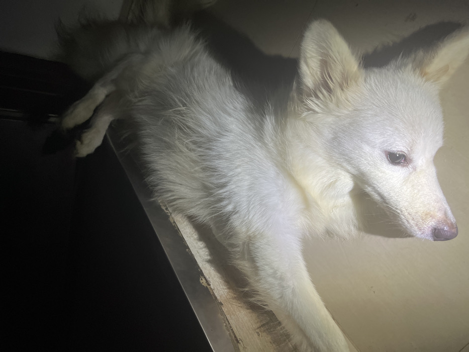 The scene is an indoor setting in Ikot Ekpene, Nigeria. A white-furred canid is centrally positioned, lying supine on a light-colored, smooth floor surface. Its head is turned approximately 45 degrees towards the viewer, with its right eye visible. The forelimbs are flexed, with the paws raised and positioned adjacent to a dark, vertical rectangular object in the background, which is separated from the floor by a thin, light-colored horizontal strip. The hind limbs are extended. The dense, white fur of the animal is strongly illuminated from a directional light source originating from the left foreground, creating distinct, elongated shadows on the floor to the right of the subject. No human subjects are visible.