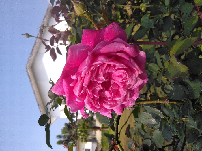 The scene, set in Bajío La Mula, Mexico, presents a close-up view of a vibrant pink rose in full bloom, centrally positioned in the foreground. The rose displays numerous tightly packed petals of varying pink shades, with some visible moisture droplets on their surfaces. It is connected to a green stem, part of a rose bush featuring dark green, ovate leaves, some also bearing a slight sheen. Multiple undeveloped rose buds are visible on various stems within the bush, particularly towards the right side of the frame. In the middle ground, a white building with a discernible light-colored gabled roof is partially visible, out of focus, behind the rose bush and slightly to the left. The upper portion of the image shows a clear, light blue sky. Out-of-focus green foliage and distant tree trunks are also present in the background. The environment is outdoors and brightly illuminated by natural sunlight, indicating a clear day. No people or animals are present, and no active interactions are depicted.