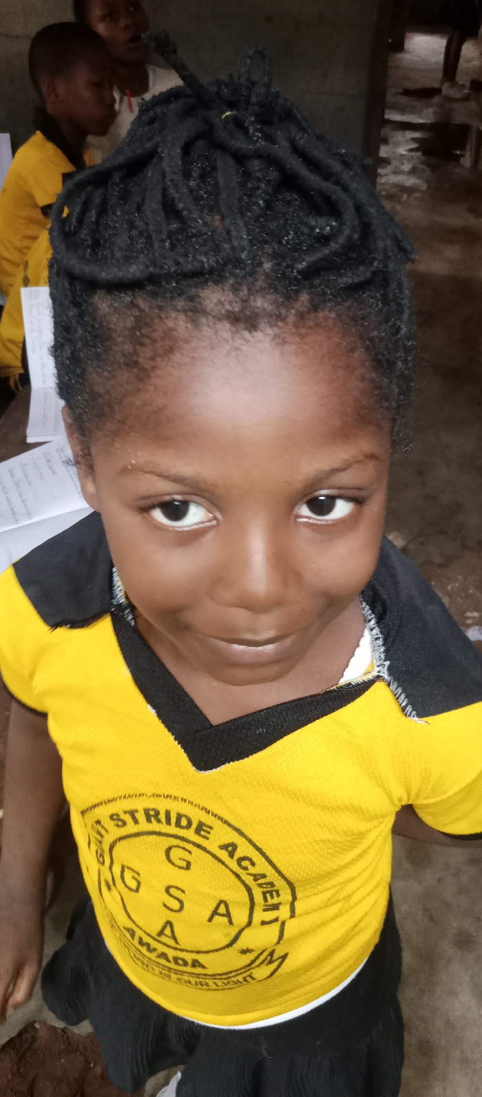 A young child of African descent is depicted in a head-and-shoulders portrait, positioned centrally and looking directly at the camera with a slight smile. The child has dark skin, dark eyes, and black braided hair styled upward and secured on top of the head with a visible yellow elastic band. The child wears a yellow short-sleeved uniform shirt with a black V-neck collar and black trim on the shoulders. A circular black logo on the shirt's front prominently displays "GIANT STRIDE ACADEMY" and "GSA," with "AWADA" and a partially legible phrase "LIGHT IS OUR LIGHT" beneath. This uniform identifies the location as Giant Stride Academy in Awada, Onitsha, Nigeria. In the left background, partially obscured, is another child also wearing a yellow uniform. White papers with visible writing are present on a surface in the left background. A third individual is indistinctly visible in the right background. The setting appears to be an indoor facility with a concrete floor, under subdued lighting.