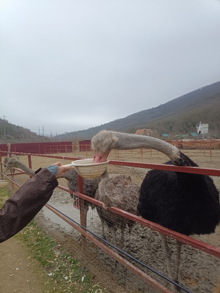 A human arm, clad in a brown pinstriped sleeve, extends from the left, holding a small white plastic colander over a red metal fence. An ostrich with a long, grey, fluffy neck and head is actively feeding from the colander, revealing reddish skin around its beak. The body of this ostrich has mixed brown and grey feathers. To its right, the black-feathered body of another ostrich is partially visible. A third ostrich's head and neck are visible further back and to the left, behind the feeding ostrich. The ostriches are within an enclosure defined by the red metal fence and a lower wire mesh fence, standing on muddy ground. In the background, rolling hills covered in sparse vegetation are visible under a uniformly grey, overcast sky. Several structures, including a partially visible building with a roof frame and smaller green-roofed buildings, are present on the distant hillside, alongside power lines and poles. The scene is an outdoor ostrich enclosure located in Терновский округ, Ukraine.