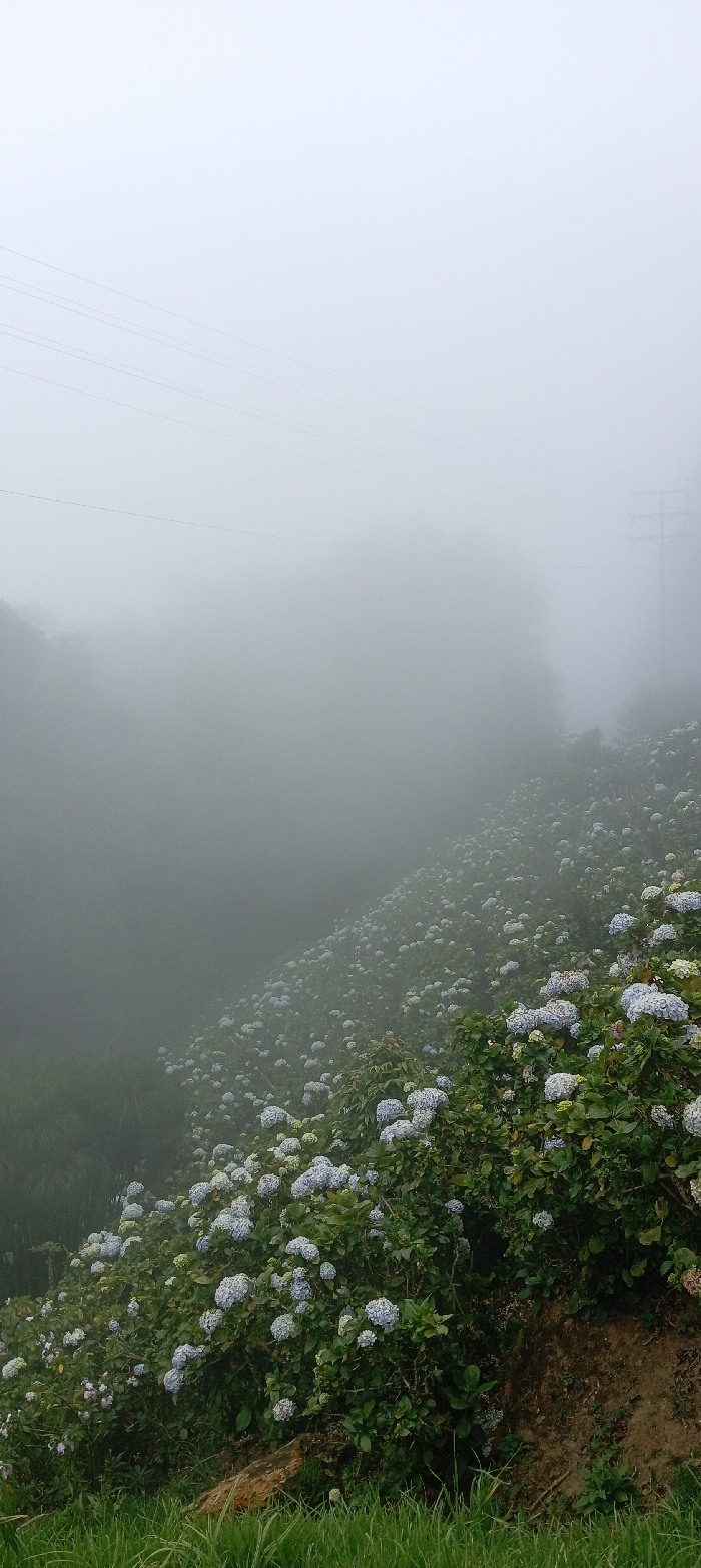 The image displays a steep, fog-covered hillside in Aguacatal, Venezuela. The foreground features green grass transitioning into a dirt slope. The majority of the hillside is densely covered with flowering hydrangea bushes, exhibiting predominantly light blue and white inflorescences. Trees are partially discernible through the heavy fog on the left side of the midground. In the upper portion, multiple thin power lines are visible, extending horizontally across the frame and disappearing into the dense atmospheric fog. A utility pole is faintly visible on the right, also partially obscured by the mist. No individuals, animals, or discernible actions are present.