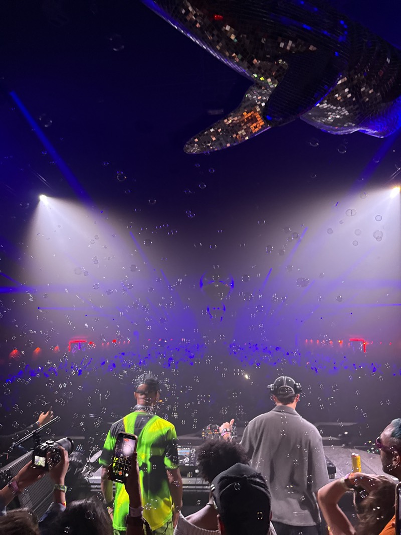 The image captures a live music event at the Sahara Tent during the Coachella Valley Music and Arts Festival in Indio, California, United States. The scene is filled with people in the foreground, mostly seen from the chest up, with arms raised, some holding phones and cameras to capture the performance. Two DJs stand on a stage, their backs to the camera. The one on the left wears a bright neon green and black shirt, while the one on the right wears a grey sweatshirt and a baseball hat. A large, reflective disco ball hangs from the ceiling, and numerous soap bubbles fill the air. Spotlights shine down from above, creating a hazy, atmospheric effect with the bubbles and light. In the background, a crowd of people is visible, illuminated by blue and purple stage lighting.