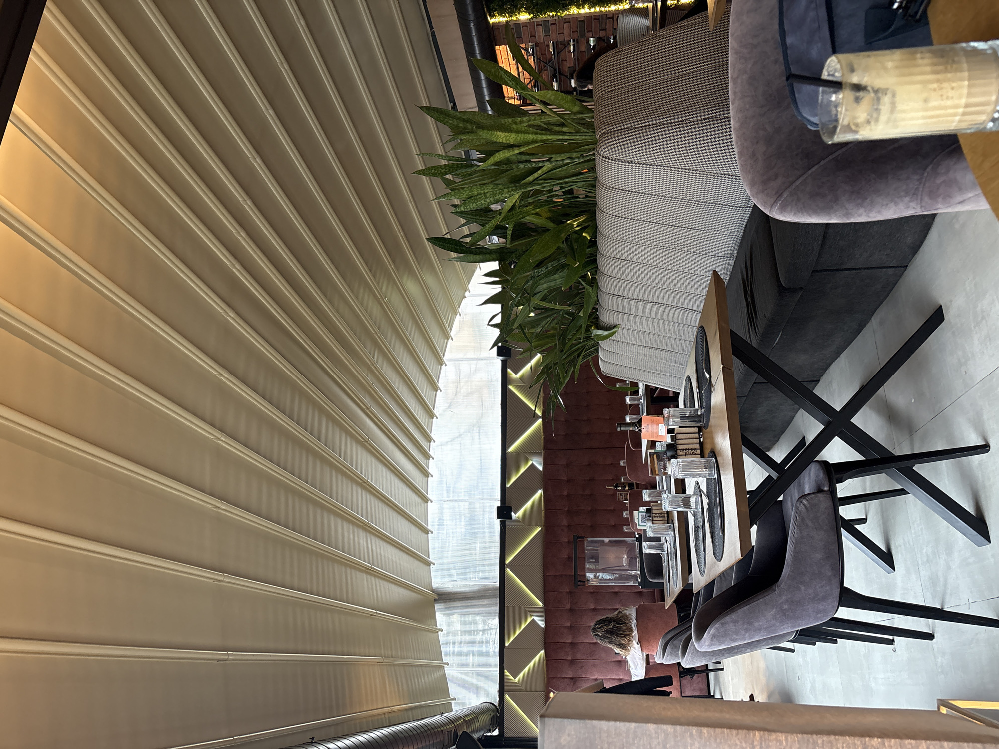 This image depicts the interior of Soul Kitchen restaurant, located at ul. "Bacho Kiro" 26, Sofia Center, Sofia, Bulgaria. The scene presents a contemporary dining area with a light beige, retractable fabric pergola-style ceiling system overhead, extending towards a large transparent roof section at the rear. A prominent feature on the left wall is a dark red, vertically paneled upholstered surface adorned with an intricate geometric pattern of illuminated horizontal and diagonal light strips. Further to the right, a dark brick wall with vertical garden elements is partially visible. The flooring is light-colored. In the midground, multiple wooden dining tables with black cross-base metal legs are arranged. These tables are accompanied by dark grey upholstered chairs with black legs. A long, fixed bench-style seating unit featuring a patterned grey and white fabric back (houndstooth or similar) and a dark grey cushion base runs parallel to the tables, serving as a divider. This seating unit incorporates a large rectangular planter containing several tall, green Sansevieria plants. Essential details include: * **People:** One individual with light brown, curly hair is visible from the back, seated in a red dining chair at a table against the red wall, wearing a light-colored top. A second person with dark hair is partially visible behind the plant divider to the right. * **Objects:** Tables are set with dark placemats, clear drinking glasses, and cutlery. One visible table holds a bottle of "Domaine Boyar" red wine and a small wooden box labeled "Soul." A transparent partition stands on a table in the background. In the immediate foreground, a tall glass containing a light brown, frothy beverage with a dark straw is positioned on an unseen table, indicating the observer's perspective. A black cylindrical ventilation duct runs along the upper left ceiling line. * **Actions/Interactions:** No active interactions are depicted; the individuals are seated, and the establishment appears to be in operation, ready to serve or currently serving patrons.