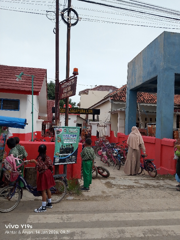 A street scene shows children in school uniforms with bicycles, near a red and white building. A woman in a hijab stands beside a bike. A sign reads "HATHHATI BANYAN ANAK-ANAK SDI JAGAPURA LOR" and a banner advertises "PENERIMAAN SANTRI BARU". Utility poles with wires are visible against a cloudy sky. The image is dated January 14, 2026.