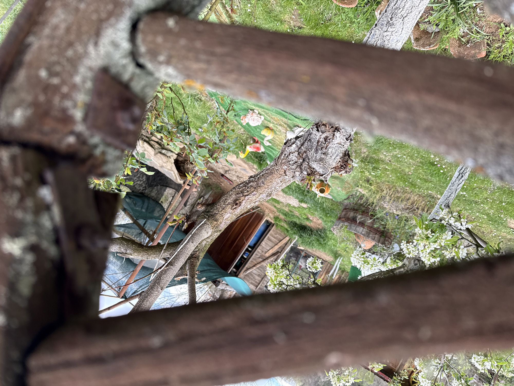 Captured from an elevated vantage point in Pokrovnik, Bulgaria, the image frames a view through a weathered wooden structure. The focal point is a backyard garden area featuring a shed, various trees (one with blossoming white flowers), and patches of grass. Garden decorations and structures, like wooden logs and tarp-covered areas, are scattered throughout the scene. The light suggests it's daytime. No people are directly visible.