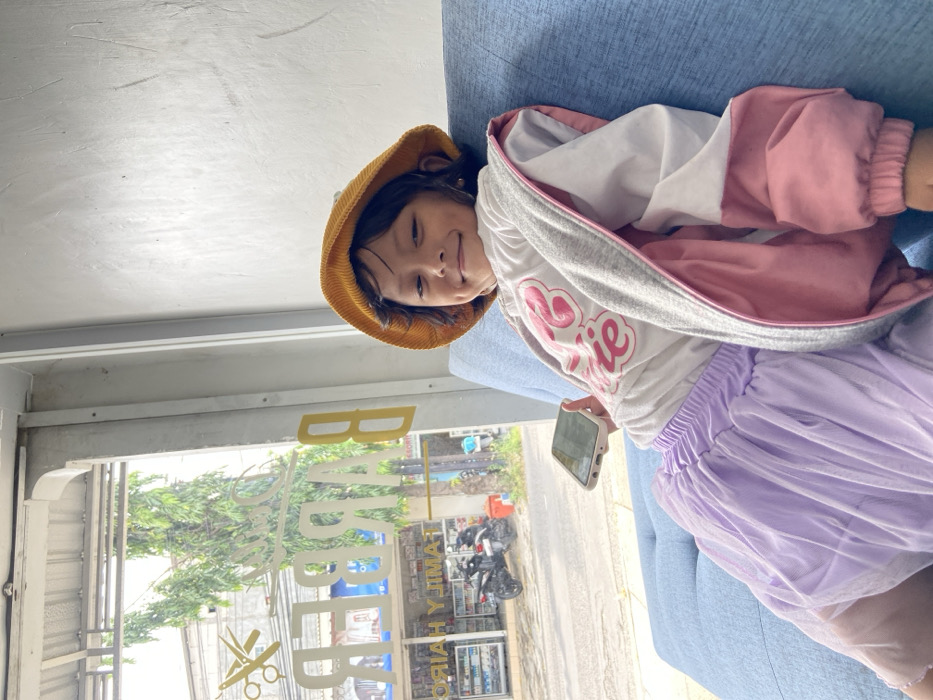 A young girl wearing a yellow hat, pink and white jacket, white Barbie shirt, and purple skirt sits on a blue couch. She holds a phone in her hand, smiling slightly. Behind her is a window with the reflection of a barber shop. Outside the window, trees, a motorcycle, and buildings are visible.