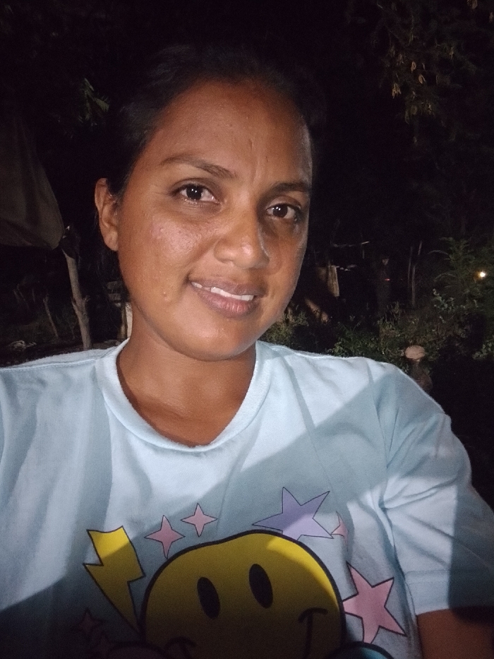 The image displays a single adult female in a dimly lit, outdoor environment, presumed to be within Altagracia, Venezuela, though the precise location is not discernible from the visual evidence. The subject, a woman with medium-toned skin, dark hair pulled back, and dark eyes, is positioned centrally, facing the camera directly. She exhibits a slight smile, revealing her upper teeth. Her attire consists of a light blue, short-sleeved t-shirt featuring a graphic design composed of a large yellow smiley face with lightning bolt eyes and numerous pastel-colored stars (pink and purple) surrounding it. The background is dark and out of focus, showing indistinct silhouettes of natural vegetation, including what appear to be trees and bushes, consistent with a nighttime setting. No other individuals, distinct objects, or specific actions are observed.