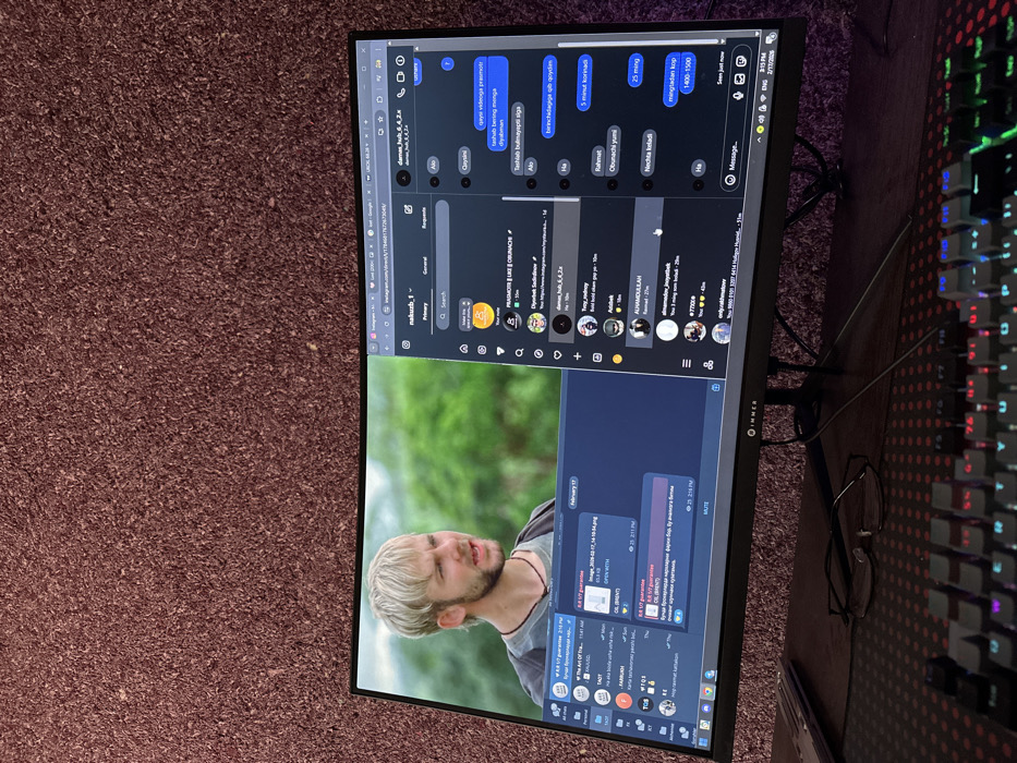 An indoor scene in Fergana, Uzbekistan, depicts a computer workstation. A large, black flat-panel monitor, branded "IMMER," is centrally positioned against a textured, reddish-brown wall. The monitor displays two applications: on the left, a Telegram interface features a fair-skinned male with short blonde hair and stubble in a video or image, alongside chat windows showing an image file dated February 17, 2020, and a chat titled "8.8 1/7 guarantee." On the right, an Instagram web interface displays a direct message conversation in Uzbek, including phrases like "Qiyini" and "Nachta keladi." The system taskbar shows the date "2/11/2026." In the foreground, a black mechanical keyboard with multi-color RGB backlighting rests on a dark desk surface. A pair of black-framed eyeglasses lies on the desk between the keyboard and the monitor stand. Cables are visible behind the monitor.
