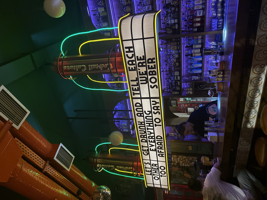A vibrant bar interior features an illuminated sign reading, "Let's get drunk and tell each other everything we're too afraid to say