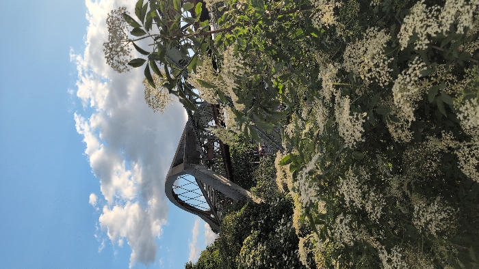 view of the Wuppertal Schwebebahn, a suspended railway system in Wuppertal, Germany. The image is taken from the ground, looking up at the Schwebebahn. The location is near the coordinates: latitude 51.255, longitude 7.142. The Schwebebahn is partially obscured by a large bush of white flowers in bloom. Green trees and leaves frame the scene. The sky is blue and clear with white puffy clouds in the background. The Schwebebahn is a metal structure with a large arch, seen partially in the image. There are no people present.